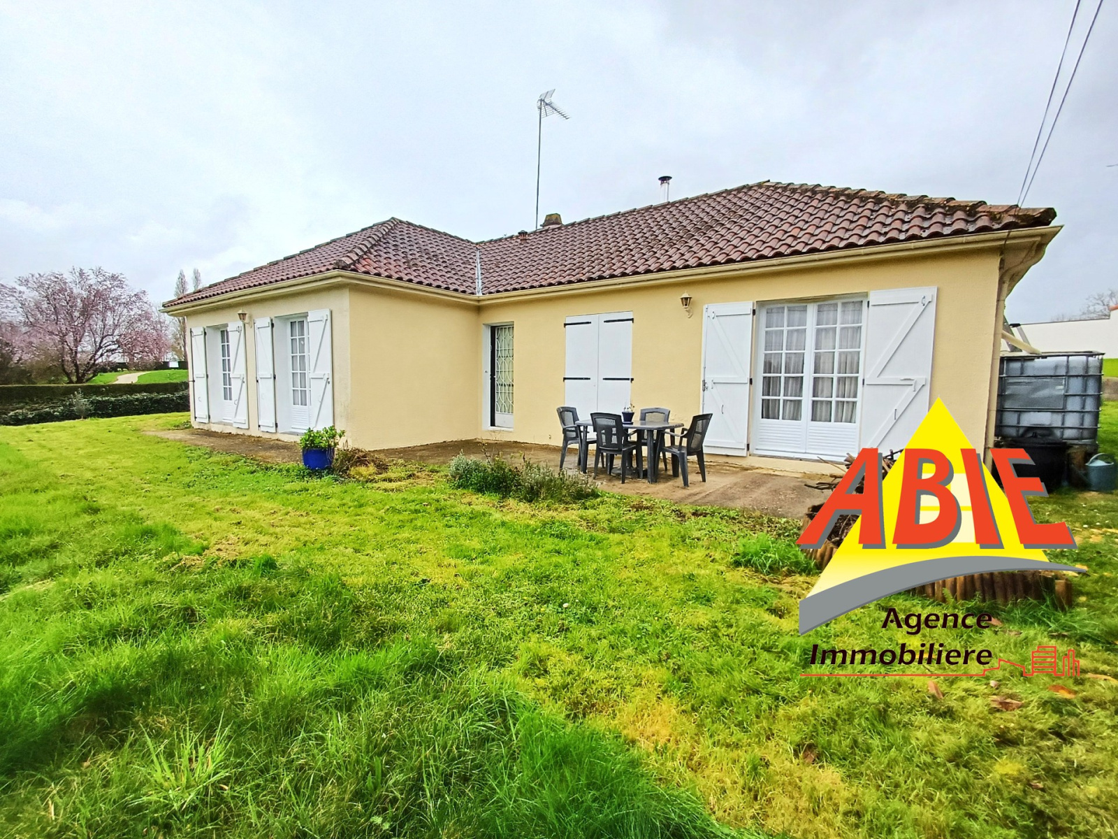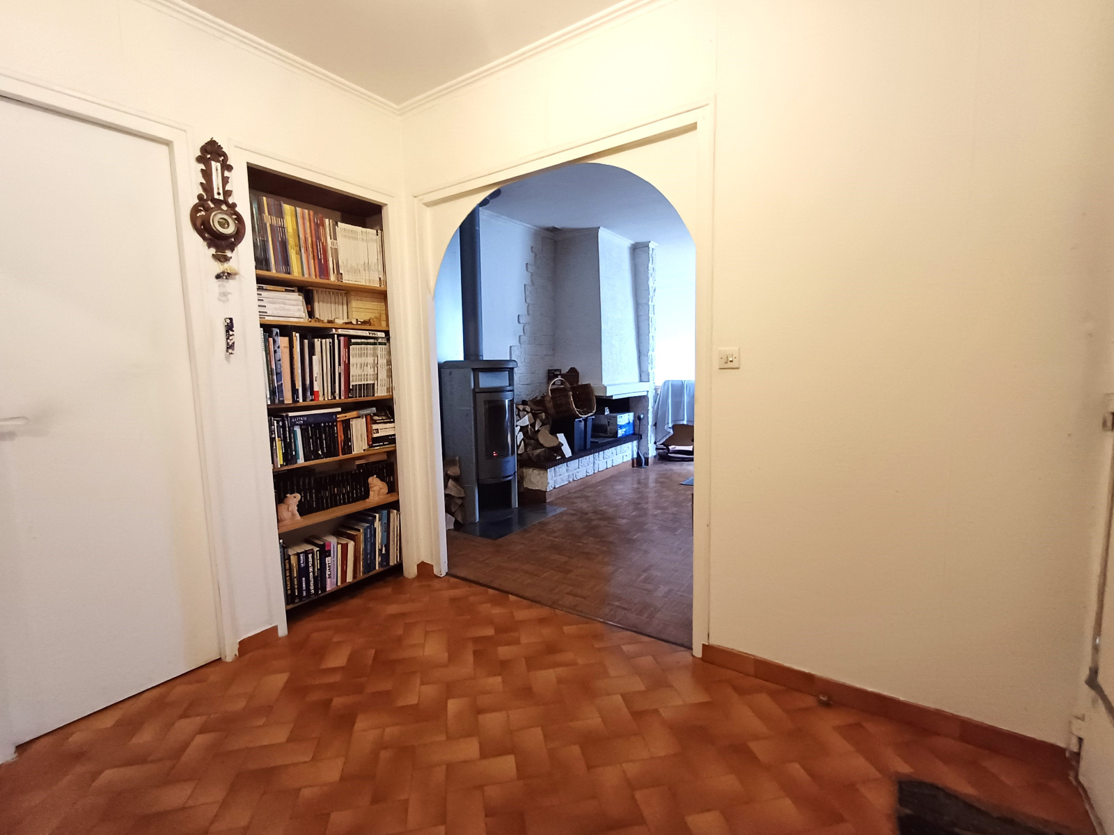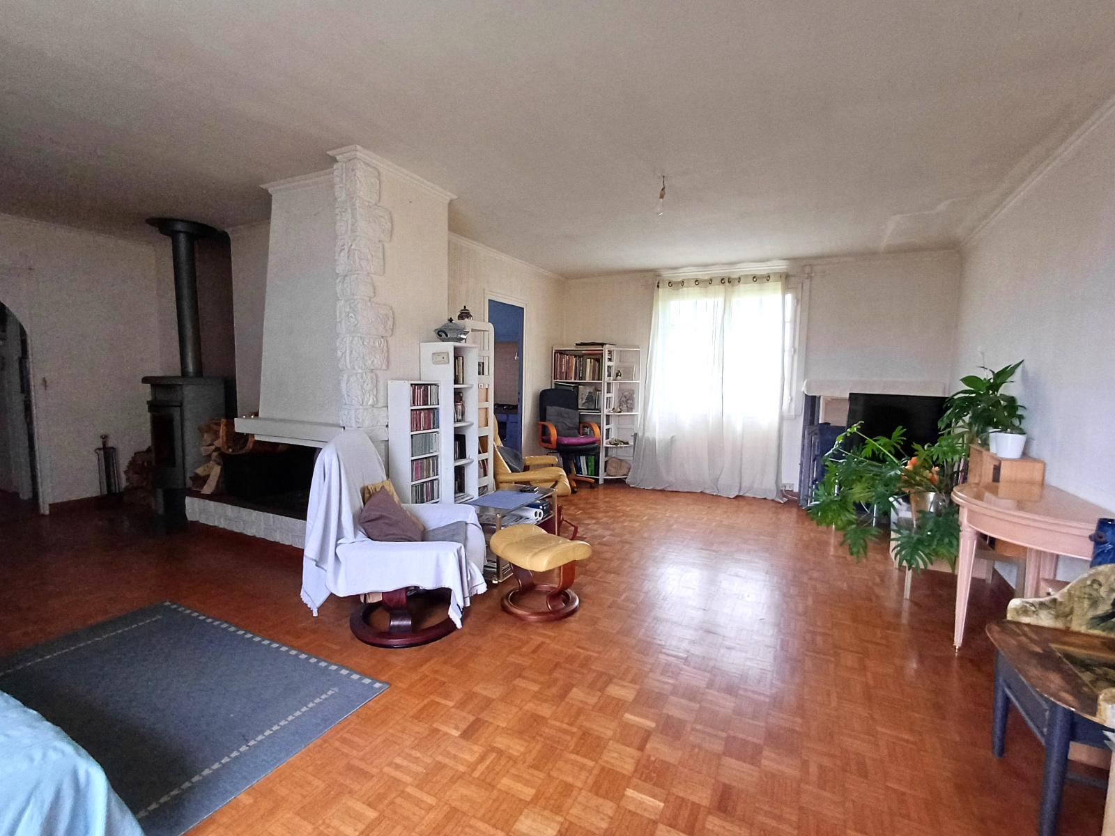 Maison de plain pied d'environ 92 m² composée d'une vaste entrée avec placard, une belle pièce de vie avec poêle à bois.