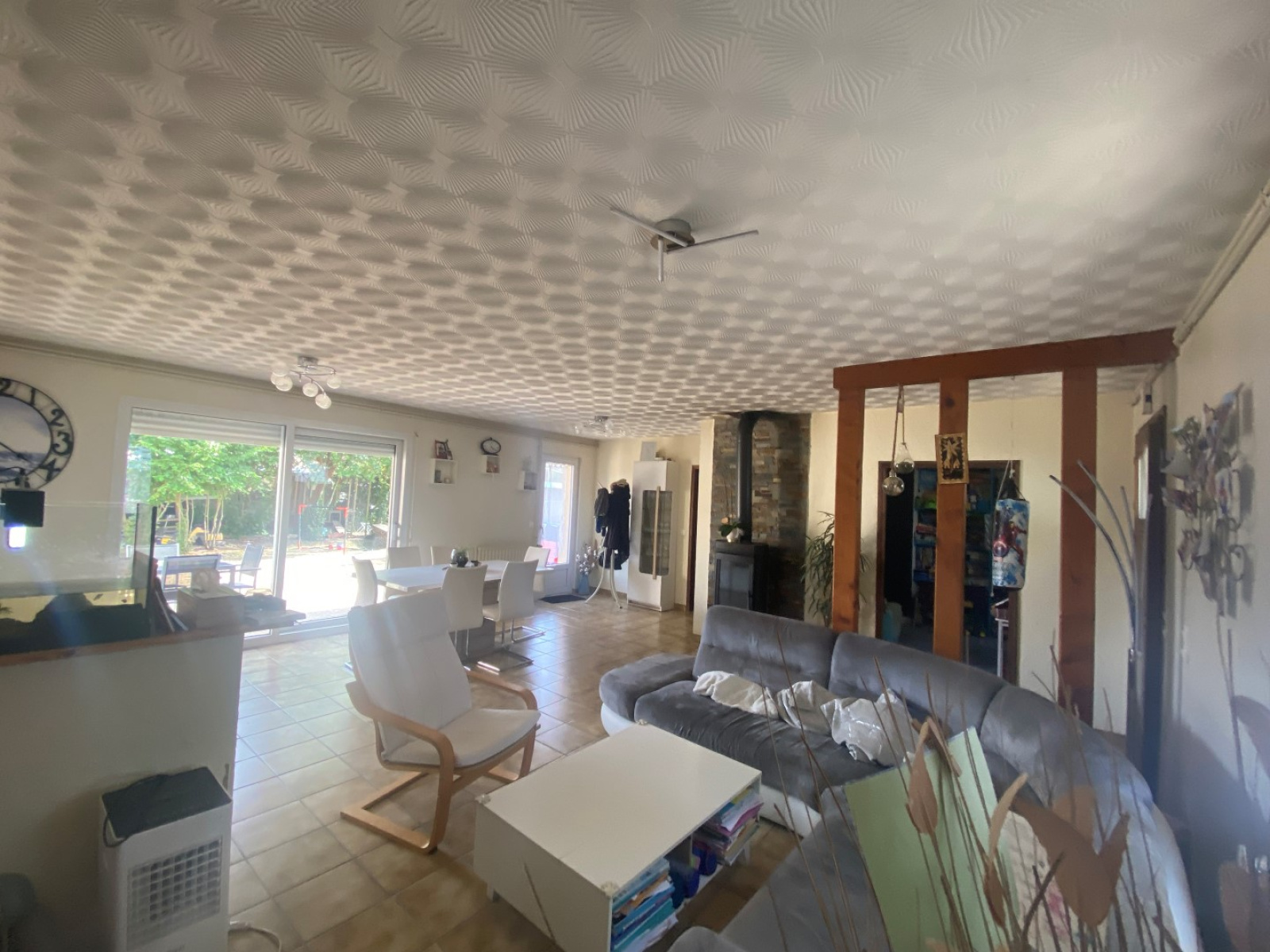 Entrée sur pièce de vie avec poêle à bois avec une salle de jeu qui peut faire office de bureau ou d'une 4ème chambre, cuisine et arrière cuisine, l'espace nuit se compose de 3 chambres, d'une salle de douche et baignoire, un wc.