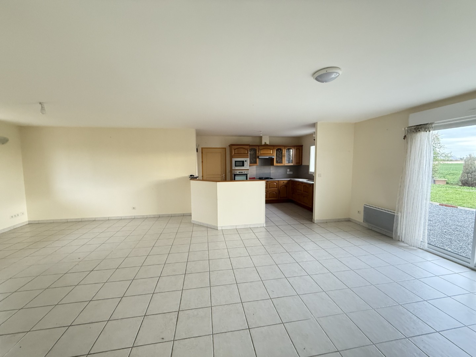 Cuisine aménagée et équipée ouverte sur une belle pièce de vie, 3 chambres, salle d'eau, WC, buanderie et garage.